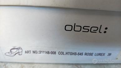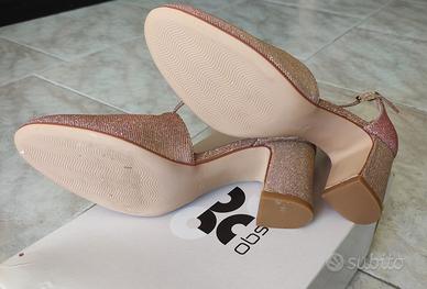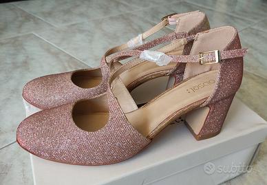 Eleganti scarpe décolleté glitterate in tonalitàoro rosa, caratterizzate da un raffinato cinturino incrociato sul collo del piede e una punta arrotondata. Marchio Obsel, misura 39, nuove, mai utilizzate.