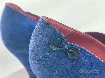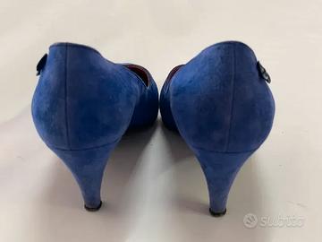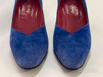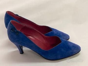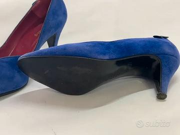 Scarpe di manifattura artigianale in camoscio con suola in vero cuoio, made in italy, tacco 70, colore blu elettrico, vendo per cambio calzata, indossata poche volte. Inclusi 2 paia di sottotacchi di ricambio