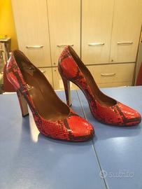 Scarpe décolleté con tacco alto rivestito in pelle cm 11,5, suola in cuoio, punta tonda, in pelle pitonata rosso/nero misura cm 39 in perfette condizioni, senza difetti. Ottimo stato tenute molto bene.