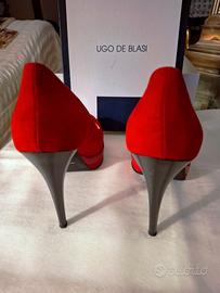 Bellissime scarpe decolletè spuntate, camoscio rosso e tacco 12, a spillo, di vernice nera taglia 39 con plateau di 2,5 cm,