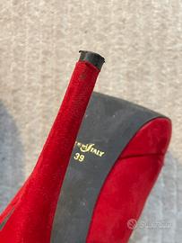 Scarpe décolleté rosse, scamosciate, con tacco 12,5 cm e plateu 2,5 cm. Numero 39. In vera pelle.