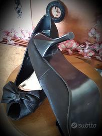 scarpe in lucido raso nero, decoltè modello chanel, fiocco davanti, punta aperta, tacco 9, misura 38, nuove mai usate.