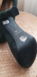 Vendo per inutilizzo bellissime scarpe decolté n. 38 (pianta stretta), camoscio vera pelle verde scuro e camoscio toupe, tacco molto alto ma con zeppa, quindi comodissime, brand "nila&nila" made in Italy, comprate e mai calzate, quindi nuove. Vendo € 45,00 cadauna, oppure entrambe € 80,00. Vero affare. No Perditempo