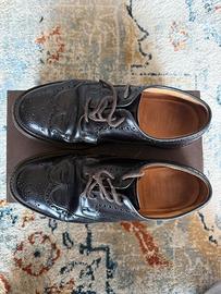 Scarpa derby stringata in pelle liscia di vitello, color testa di moro, punta arrotondata e superficie con lavorazione traforata. La suola è Dainite. Calzatura normale (075 G).