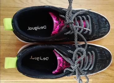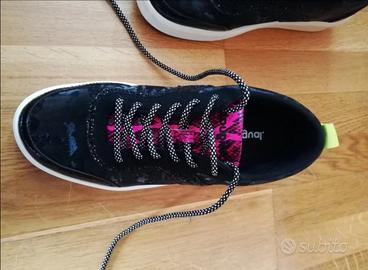 Scarpe nere con ricami e suola bianca. Linguetta interna fantasia pitonata fucsia e nera. Linguetta dietro verde con stampata la lettera D. Indossate pochissime volte.