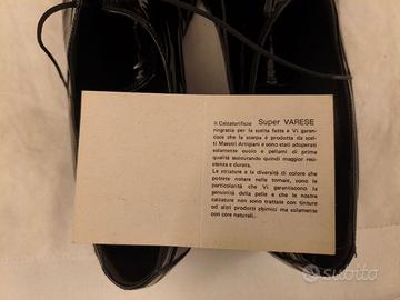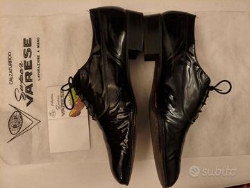 Vendo per inutilizzo scarpe di vernice nere da uomo n.43 e 1/2 (n.9 UK e n.10 USA, lunghezza cm.29), in pelle, con suola in cuoio, indossate pochissimo. Molto belle ed eleganti, utilizzabili per una serata o una cerimonia, marca Super Varese, con la scatola originale.