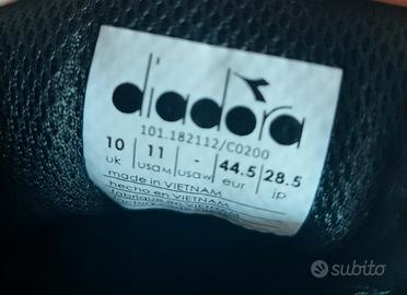 Scarpe Diadora, modello Eagle 8 SL V, Colore nero. Chiusura a strappo. Usate pochissimo. Made in Vietnam. Taglia UK 10, US 11, EUR 44,5. Disponibile a consegna a mano su Caserta o Napoli.