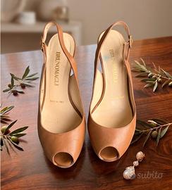 Scarpe Donna Tacco BRUNO MAGLI Originali - Pelle Cuoio - N. 35 Descrizione: Vendo splendide scarpe décolleté modello slingback (con cinturino posteriore) della celebre maison italiana BRUNO MAGLI. Le scarpe sono autentiche, realizzate in Italia in pelle di altissima qualità color cuoio, usate ma in perfetto stato (qualche piccolo segno di usura). Modello elegante con punta aperta (peep-toe), ideali per cerimonie, serate o per un look da ufficio sofisticato. 🔴 Specifiche Importanti: * Taglia: 35 Italiana * Marca: Bruno Magli * Colore: Tan/Cuoio Condizioni: Usate ma tenute benissimo. La tomaia in pelle è in ottimo stato, senza graffi evidenti. Suola interna pulita. Suola esterna con normali segni d'uso (vedi foto), tacchi in buone condizioni. Vendute come da foto (senza scatola originale). Disponibile per spedizione o ritiro a mano in zona Venezia Mestre. Prezzo: 35 € (Poco trattabile visto il marchio e la rarità della taglia).