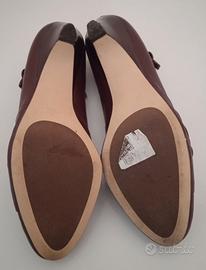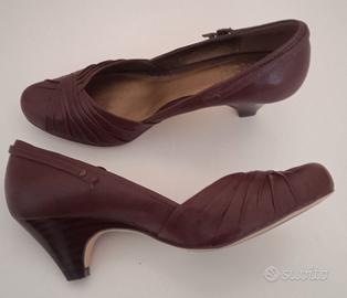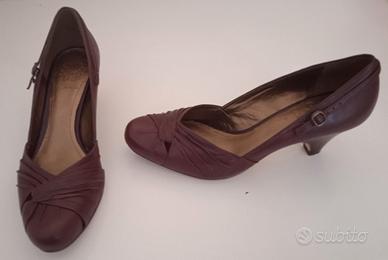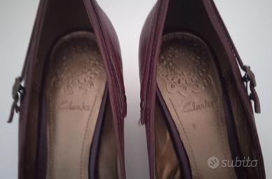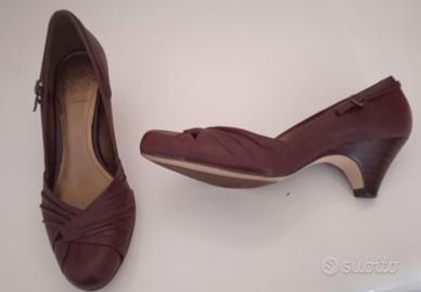Paio di scarpe in pelle - marchio CLARKS - tacco effetto legno h cm 5 - taglia 7D corrispondente al n°41 (lunghezza piede cm 25,4) calzata D corrisponde a calzata standard. I dati sono stati presi dal sito CLARKS . Sono state usate solo una volta e tolte quasi subito in quanto per me risultavano troppo strette. Non dispongo della scatola originale.