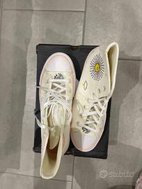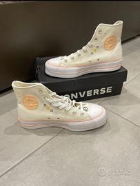 * Vendo queste splendide Converse originali modello Chuck Taylor All Star Lift Platform High Egret Cheeky Coral White con ricamo naturalistico e floreale, completamente nuove e mai indossate.