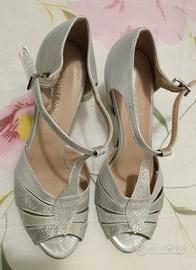 vendo scarpe donna da ballo liscio, color argento con motivi davanti, tacco cm 8, usate solo una volta e poi lasciate x motivi di impossibilità ad usarle causa tacco alto
