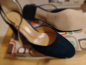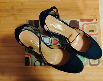 Décolleté blu in vera pelle con cinturino, numero 39. Tacco 7 cm. Marca: Nacrèé. Punta in scamosciato, tacco e tallone in luminoso glitter blu scuro. Mai indossate.