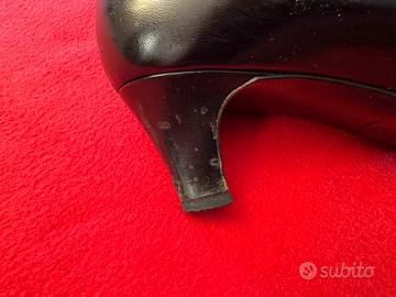 Scarpe donna décilleté taglia 35, tacco medio, in pelle liscia di colore nero e punta in pelle verniciata lucida anch’essa nera. Punta leggermente affusolata tipica delle dècolleté classiche.