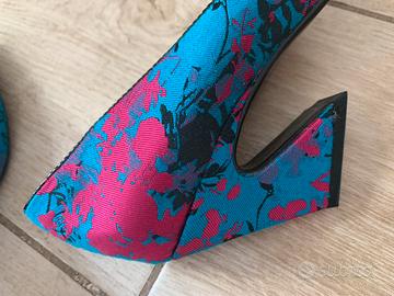 Décolleté donna mai usate, fiori , turchese e fucsia, tacco particolare cm 7 , mai usate , punta davanti, taglia 38