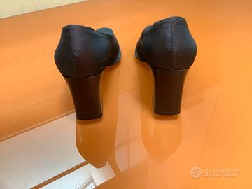Scarpe da donna decoltè marca Gastone Lucioli, in tessuto tipo shantung di seta con un elegante effetto luminoso; colore marrone testa di moro, numero 36,5. Tacco largo cm 6. Interno in vera pelle, suola in vero cuoio. Made in Italy.