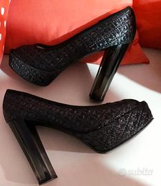 Bellissima scarpa decolté MISS SIXTY n.39 nuova con scatola elegante, materiale paglia con bordura in vera pelle colore nero, tacco quadrato in resina trasparente. Calzata comoda tacco alto ma con il platò non si percepisce