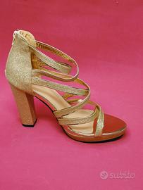 Scarpe donna eleganti n.41, veste leggermente strettino, quindi va bene per un 40,5. Color dorato molto scintillante. Tacco alto 11 cm e plateau 2 cm.