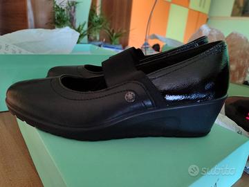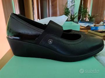 Scarpe Donna Enval soft, misura 40, colore nero con dettaglio nero lucido dietro, fascia elastica sul davanti, tacco a zeppa alto 5 cm, soletta in pelle in Memory foam, esterno in pelle e interno in tessuto, suola in gomma. Usato solo una volta, non presenta difetti.