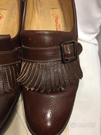 Scarpe donna in cuoio. Suole in gomma Vibram. Arricchite da frangia e fibia. Comoda pianta larga. Indossate, ma tenute bene.