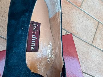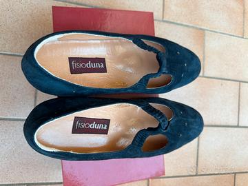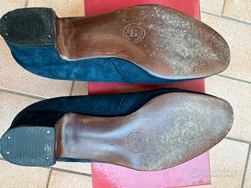 Scarpe da signora, in camoscio blu, suola in vero cuoio, lavorazione artigianale.