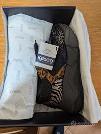 Pelle scamosciata e tessuto, colore canna di fucile con stampe giraffa e pantera.