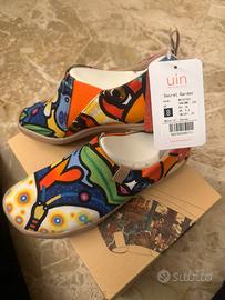 Scarpe sportive da donna con una vivace fantasia astratta e floreale in lino. 39