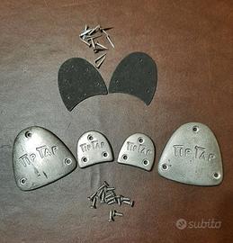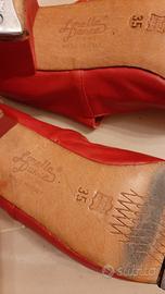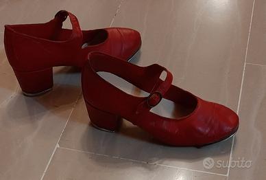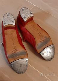 Scarpe per donna in pelle rossa con suola in vero cuoio per tip tap di Lorella Dance n. 35, buone condizioni, più una fornitura per tacco e punta in metallo oltre a quella attaccata alle scarpe, vendo a euro 15,00