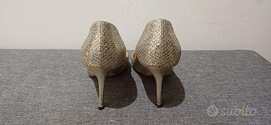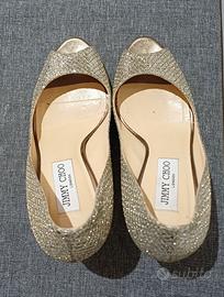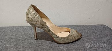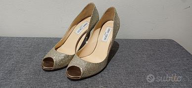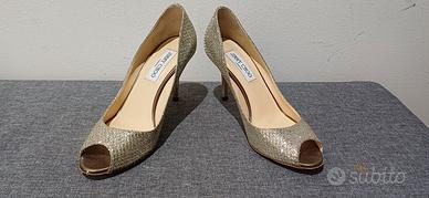 Vendesi elegante paio di décolleté firmate Jimmy Choo modello Evelyn, realizzate in raffinato tessuto glitterato color champagne. La tomaia è rivestita in glitter fabric che dona alle scarpe una brillantezza sofisticata, mentre il design peep-toe valorizza la linea del piede. L’interno presenta soletta in pelle con logo Jimmy Choo. Le scarpe sono accompagnate dalla scatola originale. Caratteristiche: Brand: Jimmy Choo Modello: Evelyn Materiale: Glitter fabric Colore: Champagne Taglia: 38.5 (EU) Punta: Peep-toe Made in Italy Scatola originale inclusa Condizioni: Ottime condizioni generali. Presentano leggerissimi segni di utilizzo, visibili nelle fotografie (in particolare nella parte anteriore della suola e della tomaia). Nel complesso rimangono un paio elegante e ancora molto presentabile. Un classico modello glamour di Jimmy Choo, ideale per collezionisti del marchio o per chi cerca una scarpa elegante e iconica.