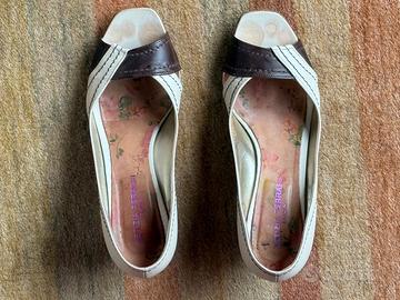 Scarpe donna, aperte davanti, in pelle color panna e moro