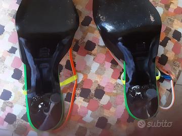 Belle scarpe da donna , marca Luciano Padovan, multicolor con fibbiette e tacco a spillo nero lucido, molto raffinate, usate un paio di volte, TG 38.5 acquistate in Costa Azzurra