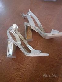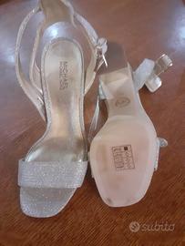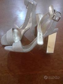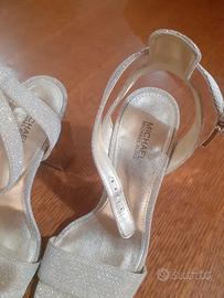 Michael Kors, sandalo donna in pelle colore oro brillantato, con tacco medio colore oro metallizato. Chiusura con cinturino. Misura 36