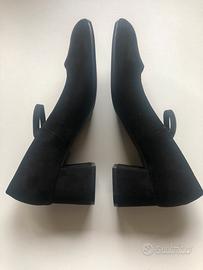 Scarpe in camoscio nero, mai usate, misura 38, modello tipo Mary Jane, con cinturino, tacco largo alto 5 cm, punta arrotondata. Soletta interna leggermente imbottita. Suole intatte.