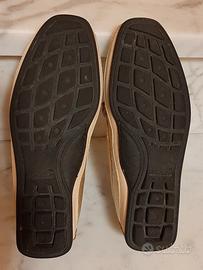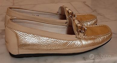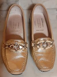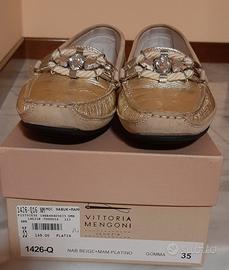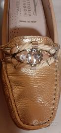 Scarpe donna n. 35, modello mocassino color oro chiaro, con decoro gioiello sul davanti e suola in gomma. Brand Vittoria Mengoni Venezia. Molto morbide e comodissime, realizzate in pelle di alta qualità. Ottimamente conservate, non presentano particolari segni di usura, come documentato in foto. Prezzo originario € 149.