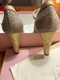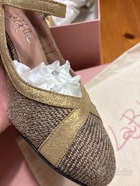 Scarpe donna “retro”. Calzature donna artigianali Made in italy. Color chocolat/millenium luna numero 37. Nuove senza cartellino. Si tratta di un paio di scarpe del marchio La Belle Shoes, un brand italiano specializzato in calzature da donna artigianali e fatte a mano. Le scarpe specifiche mostrate sono in stile Mary Jane con tacco, caratterizzate da un tessuto tweed e inserti laminati color oro