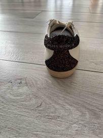 Scarpe Super-Star stella argento e talloncino in glitter marroni.