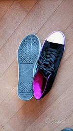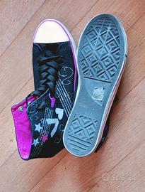 👟Vendo bellissime Sneakers TATA ITALIA Style, nero esterno con grafiche pop (scritte, cuori e stelle) e fucsia interno tinta unita, taglia 41. Stile converse (ma non sono converse originali), sono un modello grintoso e molto comodo, perfetto per dare un tocco di colore a un outfit casual. ✨Particolarità: Nelle grafiche laterali il cuoricino sotto la lettera "V" è di un bel celeste brillante (anche se in foto può sembrare grigio). 🔍 Condizioni: Le scarpe sono state indossate pochissimo, come dimostrano le suole interne ed esterne praticamente intatte, i lacci puliti e la punta in gomma bianca immacolata. Presentano solo una leggera e normale ombreggiatura sulla gomma laterale dovuta al brevissimo utilizzo. 🚚 Spedizione veloce e imballaggio super accurato!