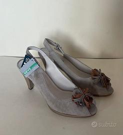 Eleganti scarpe slingback con tacco alto. - Materiale scamosciato. - Dettaglio floreale applicato sulla punta. - Cinturino regolabile sul tallone.