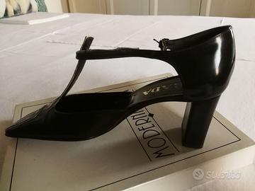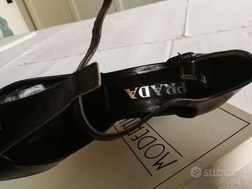Bellissime Prada originali, vera pelle e cuoio, tacco 7 cm., color marrone testa di moro, numero 36, punta squadrata con profilature in bianco e cinturino. Eleganti ma versatili e portabilissime anche con un jeans. Come si evince dalle foto portate pochissimo, pulite e in ottimo stato. Solo vendita, no scambio.