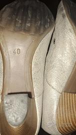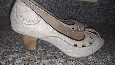 Vendo 1 paio di scarpe con tacco comodo primaverili/estive da donna, con apertura in punta e fiocchetto removibile colore beige dorato, con suola antiscivolo, misura 40. Sono usate, ma in ottime condizioni.
