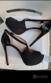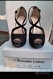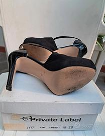 Vendo bellissime scarpe donna PRIVATE LABEL nere pelle lucida e in parte scamosciata, con fibbia oro, tacco 12,5 cm, compreso di plateau 2.5 cm, che la rende più comoda e calza molto bene. Sono come nuove usate solo una volta x una cerimonia..MADE IN ITALY