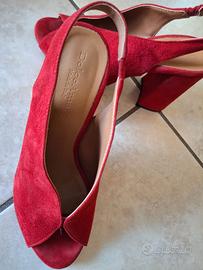 Scarpe camoscio color rosso. Tacco alto squadrato cinturino posteriore. Nuove, usate una sola volta. Marca DolceAmaro. Taglia 38. Si vendono con la loro scatola