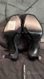 Raffinati sabot firmati Saint Laurent Paris in raso nero, impreziositi da una fitta decorazione di strass neri effetto Swarovski.