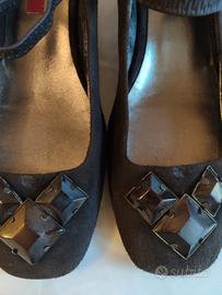 Scarpe donna per autunno/inverno marroni effetto scamosciato, marca Kammi. Modello ballerina con tacco basso e comodo. Il cinturino è elastico e non ha fibbia. Le scarpe sono state usate poco tuttavia tra i dettagli frontali mancano 2 borchiette che erano posizionate sopra le gemme (1 borchietta per scarpa). Disponibile per consegna a mano (Zona e provincia Milano nord) o spedizione.