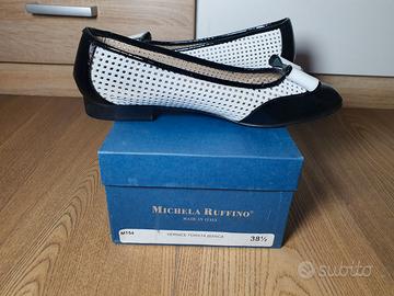 Vendo scarpe da donna tipo ballerine come da foto in vernice forata bianca e pelle Michela Ruffino made in Italy taglia 38,5 molto belle ed eleganti usate due volte in tutto, con scatola originale, vernice perfetta nessun graffio vendo a 48 euro spedisco