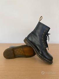 DR. Martens 100% Vegan nero n.38 anfibio da donna, stringato con 8 fori in materiale sintetico prodotto senza utilizzo di materiali animali con superfice liscia, non in pelle, morbido, di facile pulizia. Presenta la cucitura gialla tipica di questo brand. Ottima resistenza all’abrasione e antiscivolo, calzata perfetta, altezza polpaccio, altezza piattaforma 1,5cm, fettuccia posteriore con logo AirWair, alla moda perfetto da abbinare ad ogni outfit, con la stessa attitudine di sempre resistente durevole e tanto spirito Dr. Martens