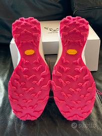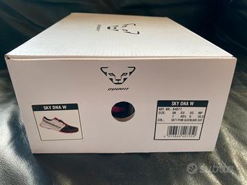 Scarpe Dynafit donna, mai indossate, non sono adatte al mio piede. Leggerissime: 207g Suola in vibram Dynafit Sky Dna scarpe trailrunning da donna estremamente reattive, ultra leggere e create apposta per vincere le Sky Races, con suola Vibram Megagrip per una presa eccellente su ogni terreno. linguetta priva di cuciture per minori punti di pressione intersuola in schiuma Pebax® la Sky DNA battistrada Vibram Litebase Megagrip per un grip ottimale su ogni terreno allacciatura Double Speed per una calzata personalizzata sofisticato sistema di tiranti, per evitare punti di pressione durante la corsa maggiore spazio in punta, per avere stabilità e controllo nelle discese veloci