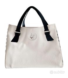 Borsa originale in eco pelle con doppi manici. Chiusa con bottone calamitato. Due chiusure interne con lampo di cui uno centrale più grande a dividere lo spazio Interno in sue scomparti. La borsa è dotata di tracolla regolabile e removibile che ne permette l’utilizzo anche a spalla o in diagonale. Come nuova.