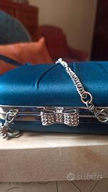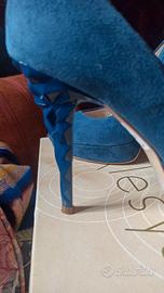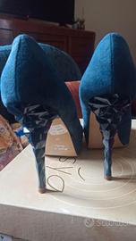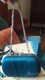 Scarpe tacco 12 particolare con forma diamantata. Scarpa in camoscio e tomaia vera pelle . Abbinata Borsa in raso stesso colore con chiusura con strass. Il tutto pari a nuovo indossato una volta per matrimonio figlia. La punta delle scarpe presenta una leggera screpolatura