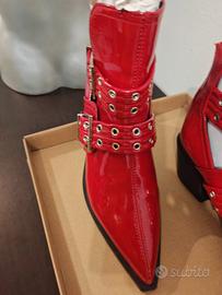 Set composto da stivali rossi con dettagli metallici e un cappello a secchiello coordinato. Un look audace e alla moda.