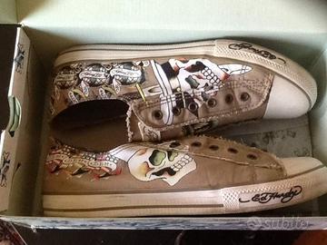 Vendo scarpe Ed Hardy num 44, simili All Star. Modello Slip on senza lacci colore beige con stampe. Scarpe nuove e mai usate.